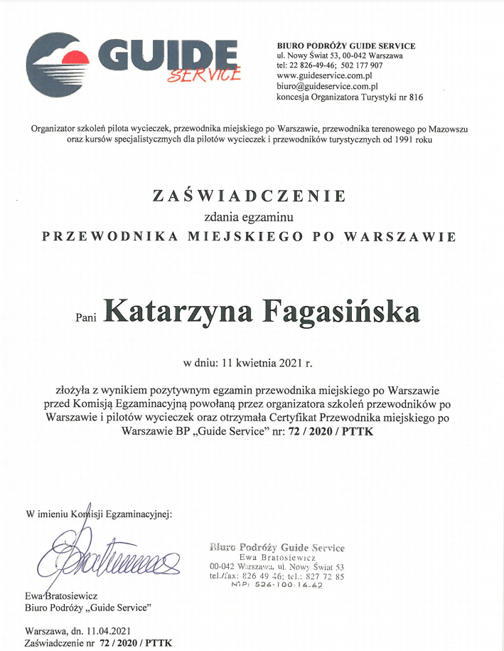 Licencjonowani przewodnicy po Warszawie, twórcy projektu „Magia Warszawy”. Oprowadzamy młodzież szkolną, dorosłych, grupy zorganizowane i turystów indywidualnych. Przygotowujemy na życzenie wycieczki i spacery tematyczne po Warszawie. Język polski i angielski.